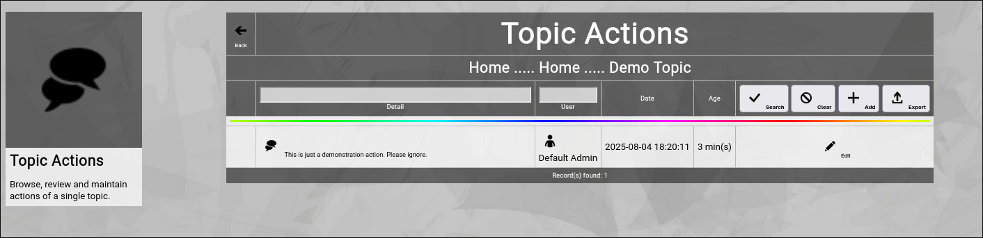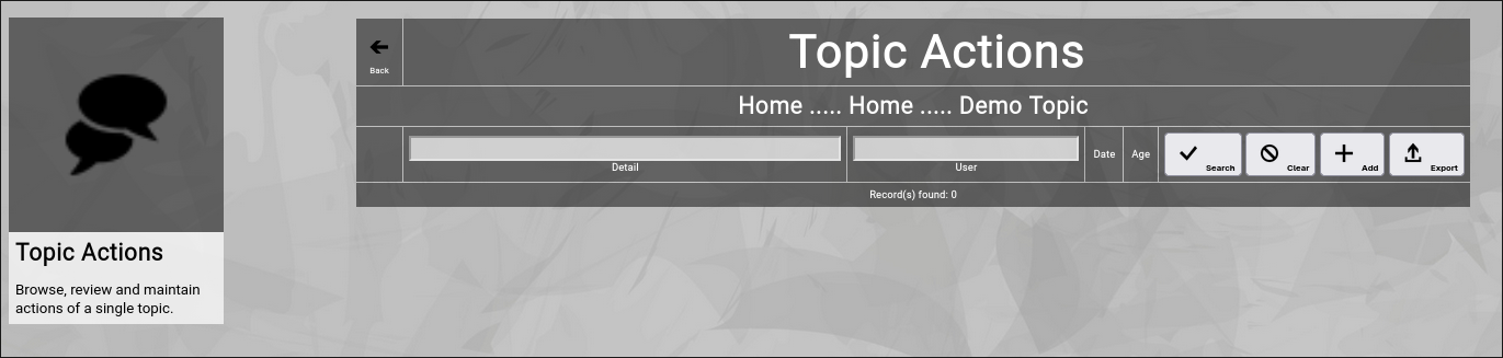 Some views in Zingoolarity also render the actions associated with the topics (most prominently, the summary screen, which is also explained in this chapter).